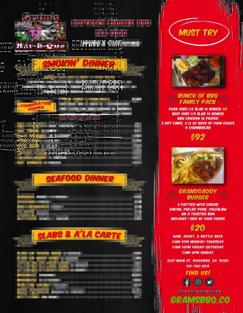 Welcome to Gram's BBQ, where every bite is a journey through the rich flavors of authentic Southern BBQ right here in Riverside. Our BBQ menu is a celebration of smoked meats, zesty sauces, and home-style sides, all crafted with care and a dash of local flair. You can view our bbq menu photo gallery here.