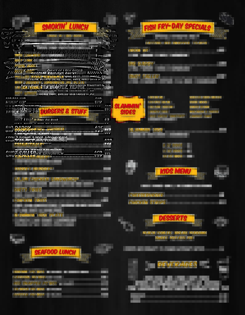 Seafood lovers, rejoice! We've got you covered with our selection of Fried Shrimp, Catfish, Red Snapper, and Tilapia. Each dish is prepared to perfection and served with two slamin’ sides and Cornbread.